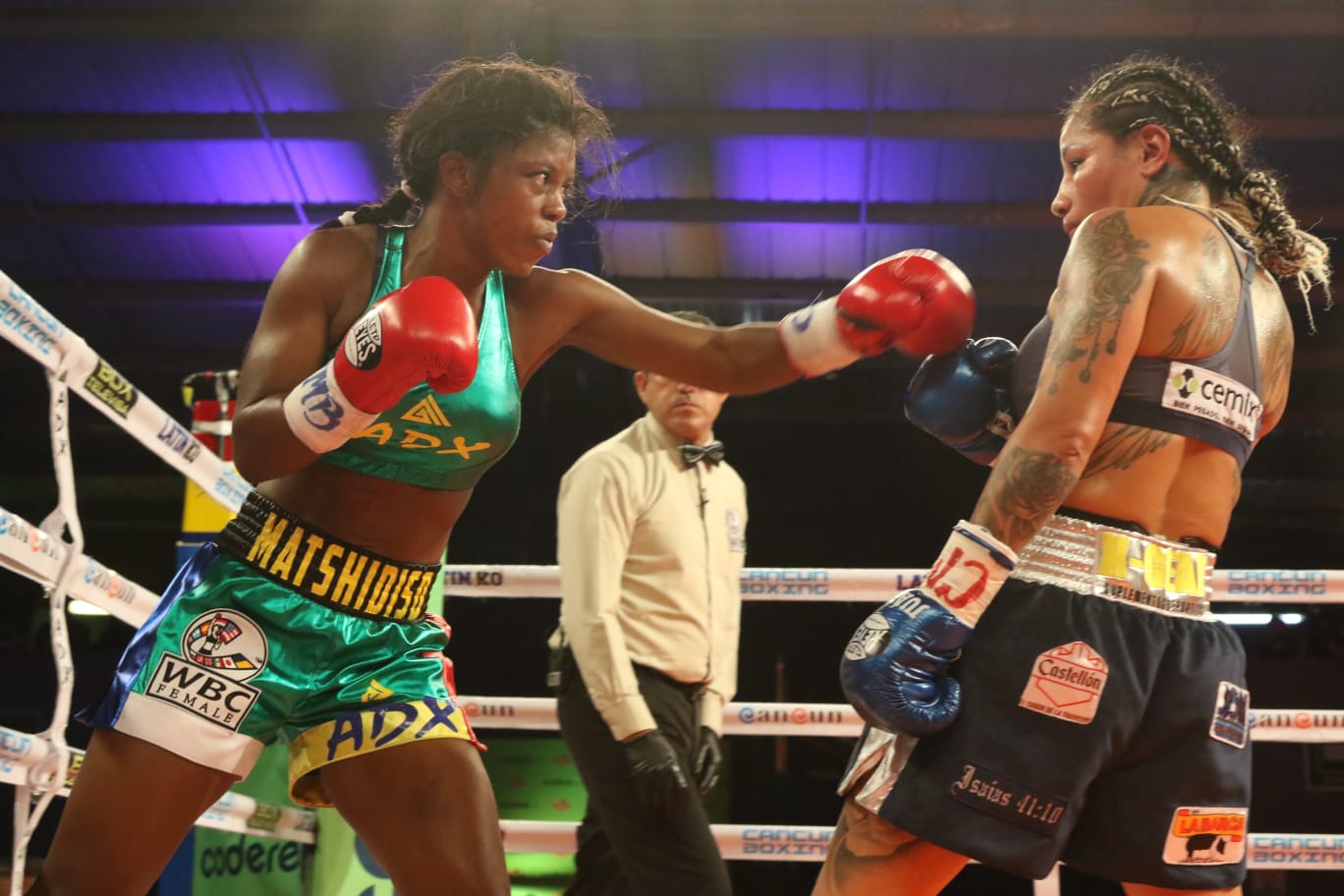 El referee César Castañón estuvo cerca de las acciones en todo momento, previendo que pronto tendría que intervenir en favor de Mokebisi ante la superioridad de la mexicana, haciendo estallar en júbilo a los presentes cuando determinó que era suficiente castigo y decretó el nocaut técnico en nueve capítulos en favor de la ‘Reina de Reinas’ que consiguió su nocaut número 20 en 56 victorias.