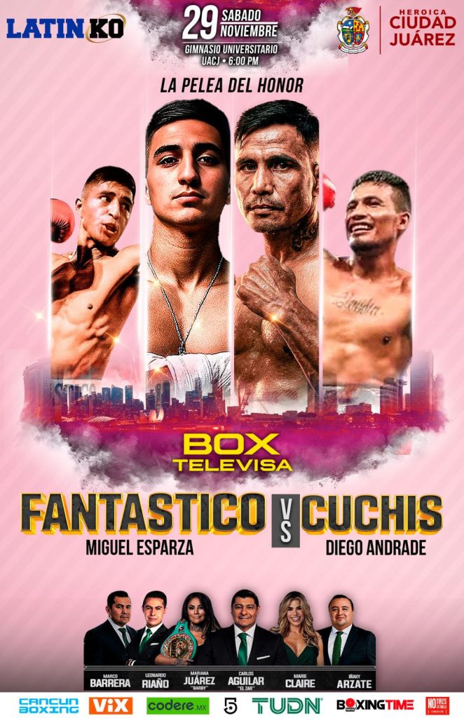 Dos ponchadores con impresionantes registros noquedores, el juarense Miguel ‘Fantástico’ Esparza y el duranguense Diego ‘Cuchis’ Andrade, colisionan el próximo sábado 29 de noviembre en el Gimnasio Universitario UACJ; en una contienda que parece no hará huesos viejos pues el ‘Fantástico’ registra 14 cloroformos en 20 triunfos, con una racha que incluye cinco nocauts en sus últimas seis victorias; mientras que Andrade en 38 combates ha enfrentado a 21 invictos, haciendo gala de una granítica resistencia y una pegada que puede sorprender a cualquiera, por lo que el fronterizo deberá estar atento en todo momento si quiere mantenerse entre los principales contendientes de las 130 libras, división en la que el pupilo de la familia Montiel ha irrumpido con fuerza gracias a poder de sus puños.