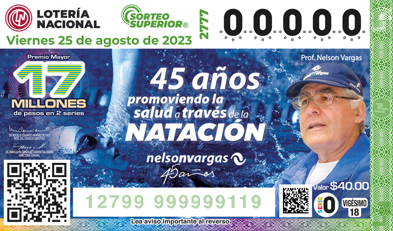 El Sorteo Superior Número 2777 cuenta con un Premio Mayor de 17 millones de pesos en dos series, en el que la Lotería Nacional ha plasmado el 45 aniversario de la Acuática Nelson Vargas, para dar testimonio de su entrega y promoción por la salud a través de la natación y el deporte como un medio de integración familiar y social. Actualmente la empresa deportiva cuenta con 17 sucursales que imparten el deporte como beneficio saludable.