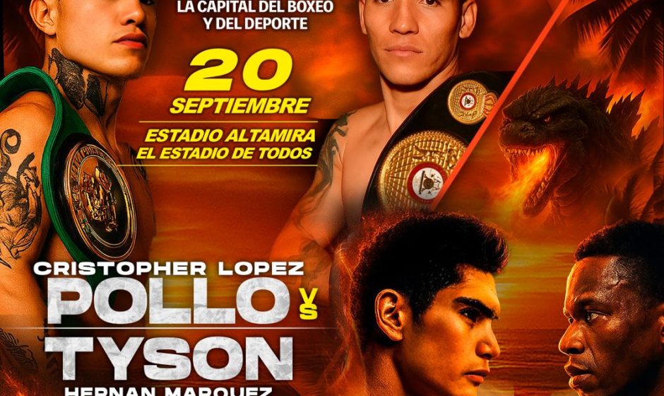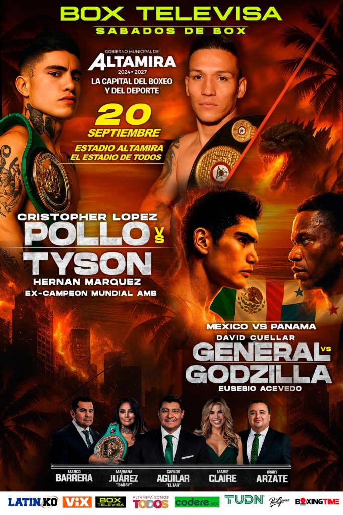 El próximo 20 de septiembre la ciudad de Altamira, Tamaulipas; se viste de gala para albergar un evento del más alto nivel boxístico, con el regreso de los tradicionales ‘Sábados de Box’ de Box Televisa; con dos duelos de alto voltaje en el Estadio Altamira, ‘El Estadio de Todos’; el invicto tapatío Cristopher ‘Pollo’ López con una racha impresionante de victorias por la vía del cloroformo enfrenta al ex campeón mundial Hernán ‘Tyson’ Márquez con 12 duelos frente a monarcas de orbe; mientras que el queretano David ‘El General’ Cuéllar buscará afianzarse entre los principales contendientes con su estilo vistoso y gran carisma frente al panameño Eusebio ‘Godzila’ Acevedo que llega a este combate con un 75% de efectividad noqueadora. En lo que será una trasmisión a millones de hogares con las voces expertas de ‘El Zar’ Carlos Aguilar, los grandes campeones Marco Antonio Barrera y Mariana ‘La Barby’ Juárez, así como el seguimiento de Iñaky Arzate y la belleza de Marie Claire Harp; en una presentación de Latin KO Promotions, empresa que dirige Oswaldo Küchle; en asociación con Cancún Boxing de Pepe Gómez y Boxing Time de Memo Rocha; gracias las facilidades otorgadas por el Gobierno Municipal de Altamira que encabeza el Dr. Armando Martínez Manríquez.